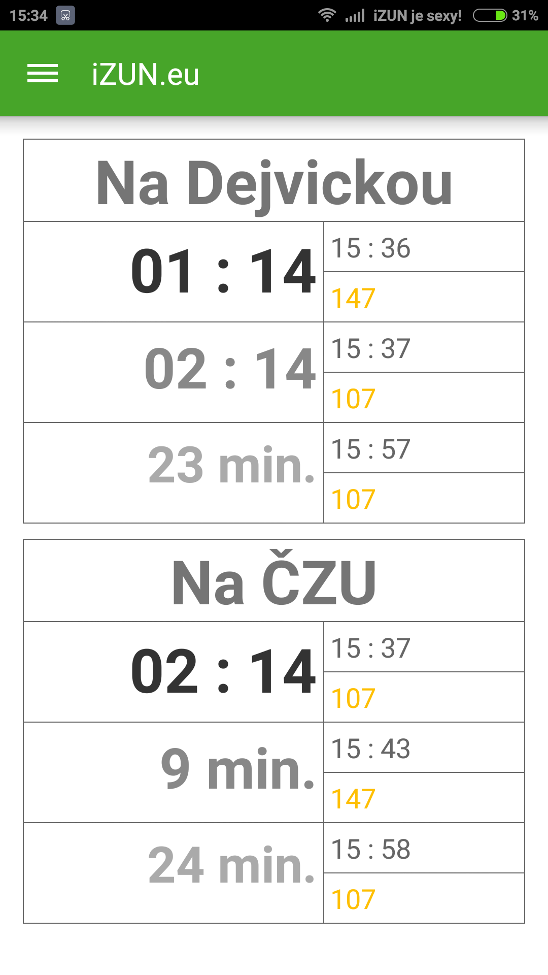Na domovské obrazovce přibyla nová dlaždice s autobusem a číslovkou 107. Zavede vás do přehledné tabulky s časy nejbližších odjezdů autobusů 107 a 147 jak z Dejvické, tak i ze zastávky Zemědělská univerzita. Jízdní řády jsou uloženy ve vašem telefonu a nezatěžují tak zbytečně datový limit. Jen jednou za čas si aplikace zkontroluje nové časy.