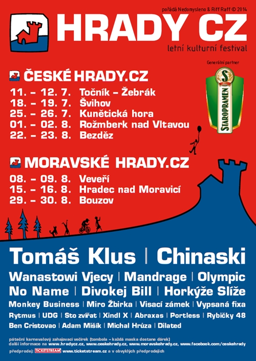 Můžete si udělat takovou Tour de Hrady a objet všechny níže sepsané hrady. No, anebo můžete jet jen na jeden. Je to na vás. Pokud chcete vidět TOMÁŠE KLUSE 8 × v domnění, že vás uvidí a zamiluje se do vás jako vy do něj, jeďte. Plán na prázdniny by tedy byl více než jasný. Kromě Tomáše Kluse uvidíte i MANDRAGE, NO NAME, WANASTOVI VJECY, HORKÝŽE SLÍŽE, MONKEY BUSINESS nebo RYTMUSE.