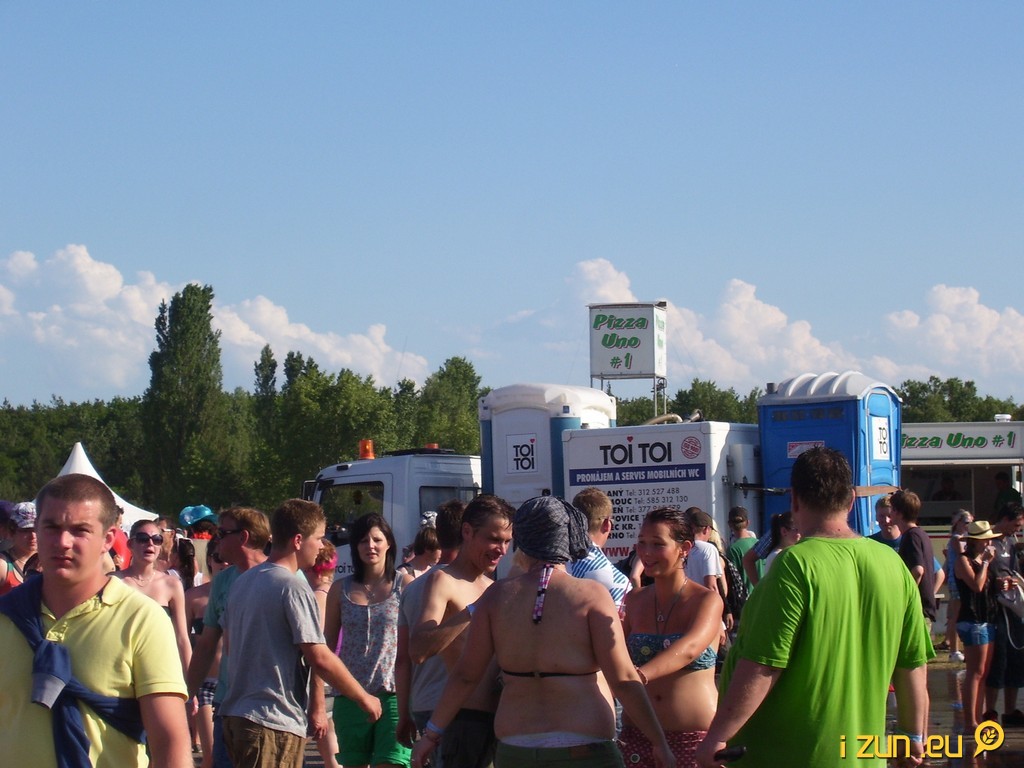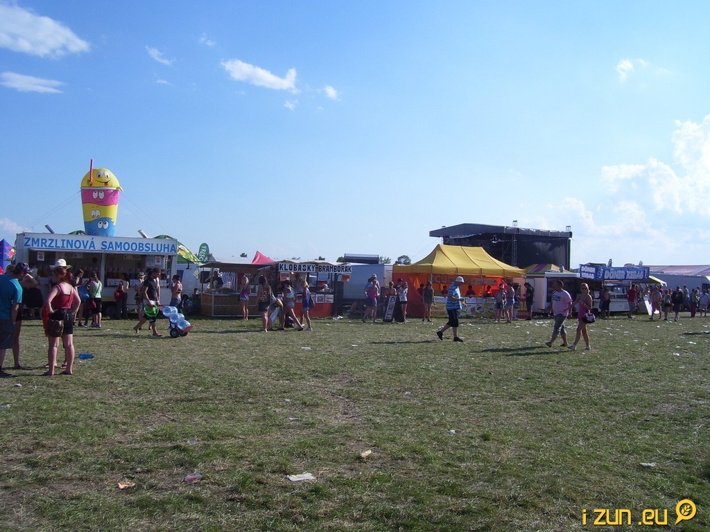 Dostat se v pátek na festivalové parkoviště nebylo úplně jednoduché. Každého ale o to spíš mile překvapilo, že se u modrých budek se záchody netvořily žádné fronty. V pátek budky relativně ještě voněly, ale v sobotu aby člověk stál 20 metrů od nich. K tomu jistě přispěly i „antické sloupky“, u kterých vykonávali potřebu muži. Občerstvovacích stanic bylo dostatek, takže ani zde jsme nemuseli čekat. Chvilku nám trvalo vystát frontu na pivo, ale ani to nebyl větší problém.