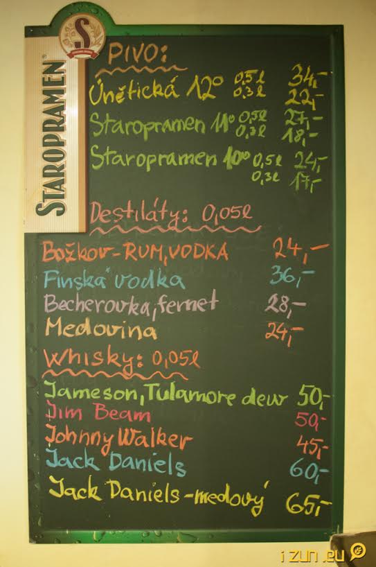 Nabídka alkoholu je rozmanitá a určitě nebude chybět Váš oblíbený nápoj. Trochu netradičně se dočkáte panáka o objemu 0,05l, na rozdíl od dnes zavedeného standardu 0,04l, za velmi příznivé ceny (medovina, rum, vodka nebo zelená za 24 Kč). Pivko volíme mezi 10° a 11° Staropramenem, nebo již dříve zmiňovanou Únětickou 12°, která stojí příjemných 34 Kč, stejně jako v Unětickém pivovaru. Abychom nezapomněli na řidiče, tak restaurace nabízí točenou Kofolu a malinovku.