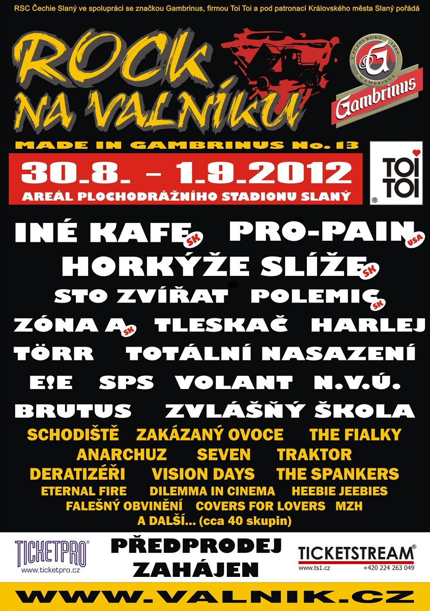 Tradiční punkovo-rockový závěr léta dostal do vínku nový areál. Doufejme, že mu pořadové číslo 13 nepřinese smůlu a rozjede to opět ve velkém stylu. Ze slovenské stáje k přijedou INÉ KAFE, HORKÝŽE SLÍŽE a ZÓNA A. Až ze zámoří pak zavítají PRO-PAIN. Jinak se těšte na českou klasiku. Nebudou chybět EEČKA, SPS, TLESKAČ, HARLEJ, N.V.Ú... Na 13. ročníku vystoupí přibližně 40 kapel. Pogovat se sice bude jen u jednoho pódia, ale z vlastních zkušeností vím, že alespoň nic nepropásnete a budete mít čas na pivo a ostatní festivalové radovánky.