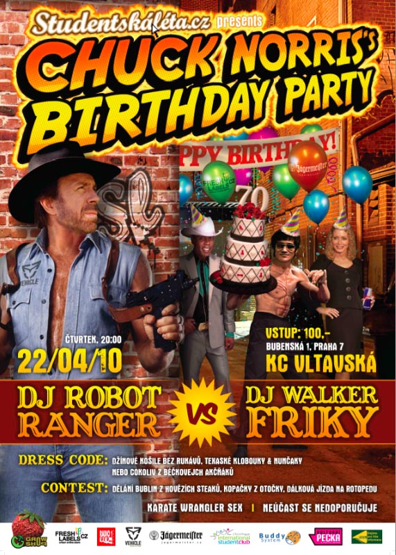 Studentská léta.cz si proto dovolují vzdát holt mistru Chucku Norrisovi a rozhodli se uspořádat oslavu jeho 70. narozenin! Nejzásadnější narozeninová párty, jakou kdy měla Praha tu čest hostit, se uskuteční 22. dubna 2010 v důstojném prostředí KC Vltavská. Nebude nouze o kopačky z otočky, hovězí steaky a texaské roztleskávačky. Dress code je jasný: džínové košile bez rukávů, nunčaky, stetsony a kimona. Zkrátka – přijďte oblečení jako Vaše nejoblíbenější hvězda béčkových akčňáků. Čím lepší kostým, tím větší šance na přežití.