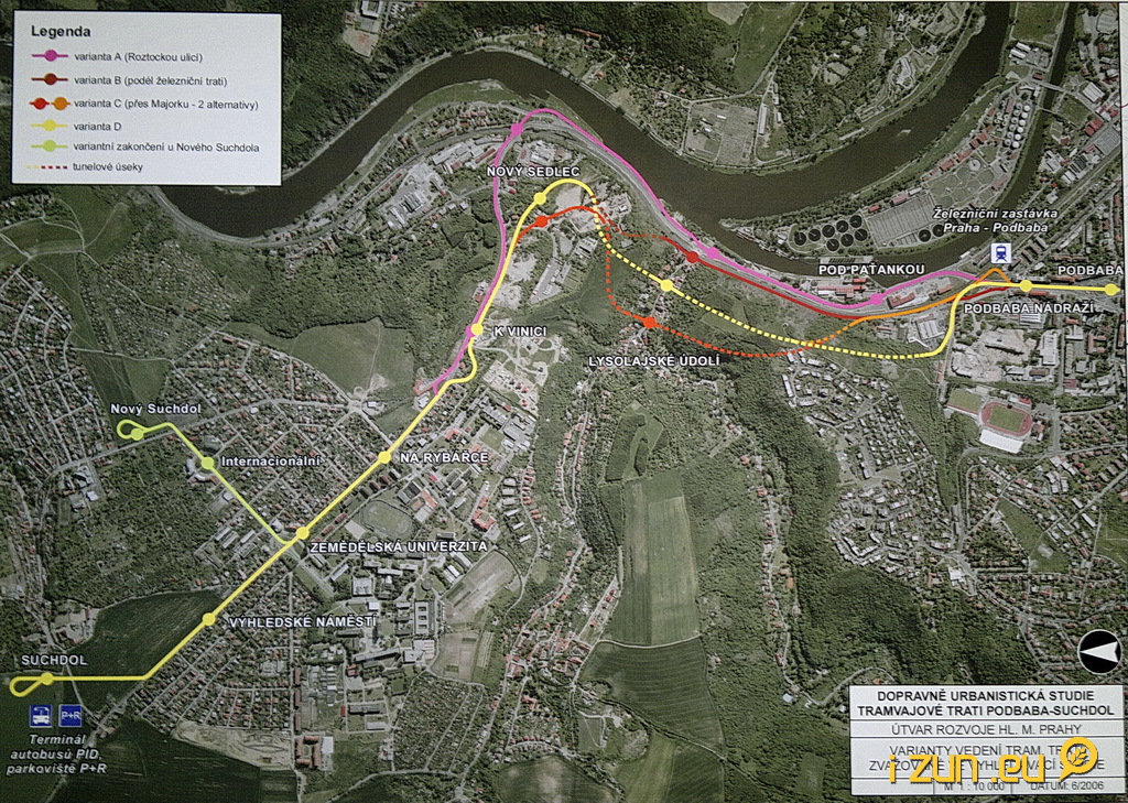 Dopravně urbanistická studie tramvajové trati Podbaba - Suchdol navrhla v roce 2006 pět variant vedení tramvajové trati. Varianta A by vedla přes Roztockou ulici, varianta B zvažuje vedení podél železniční trati, varianta C má dvě alternativy přes Majorku, varianta D by vedla přes Lysolajské údolí. Varianty B, C a D by vyžadovaly tunelové úseky. Tramvajová trať by měla končit ve stanici Suchdol, ovšem ve studii se také uvažuje o variantním zakončení v Novém Suchdole. Pro studenty ČZU je ale hlavní to, že povede přes stávající zastávku Zemědělská univerzita. Návrh vedení linek celkové hromadné dopravy do Suchdola z roku 2007 ukazuje linku autobusu, která by byla zavedena podél Vltavy přes zastávky Roztocká, Sedlecký přívoz a dále na Roztoky.