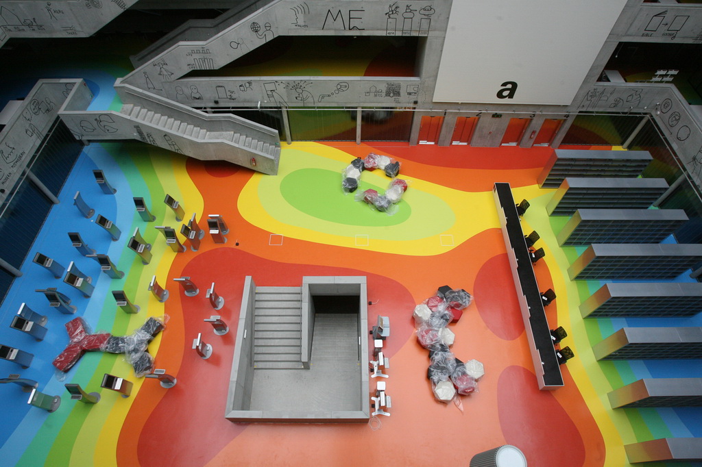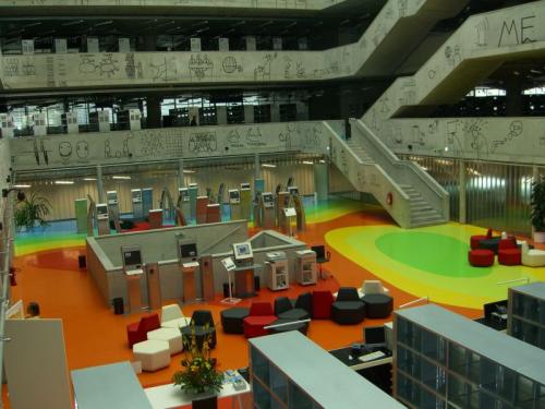 V budově je rychlá wifi síť, mnoho multifunkčních kopírek, volně přístupných počítačů, míst k sezení a luxusních záchodů. V posledním patře je možné vyjít na čerstvý vzduch do jedné z venkovních teras. Interiér budovy je převážně v šedé barvě pohledového betonu. Tuto ne příliš příjemnou barvu vyvažují barvy podlah z barevného kaučuku, které znázorňují mechanické zatížení budovy.
