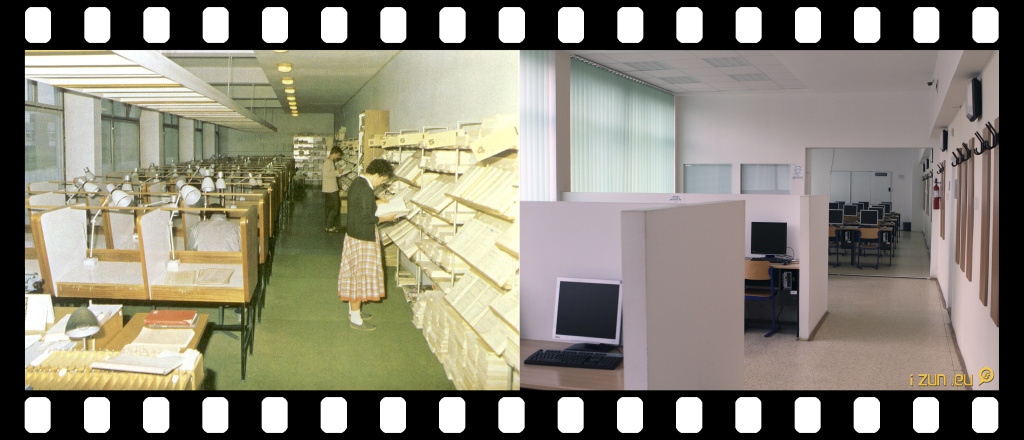Starší fotografie zachycuje čítárnu časopisů na rektorátě. Dnes je místo ní moderní počítačová studovna.