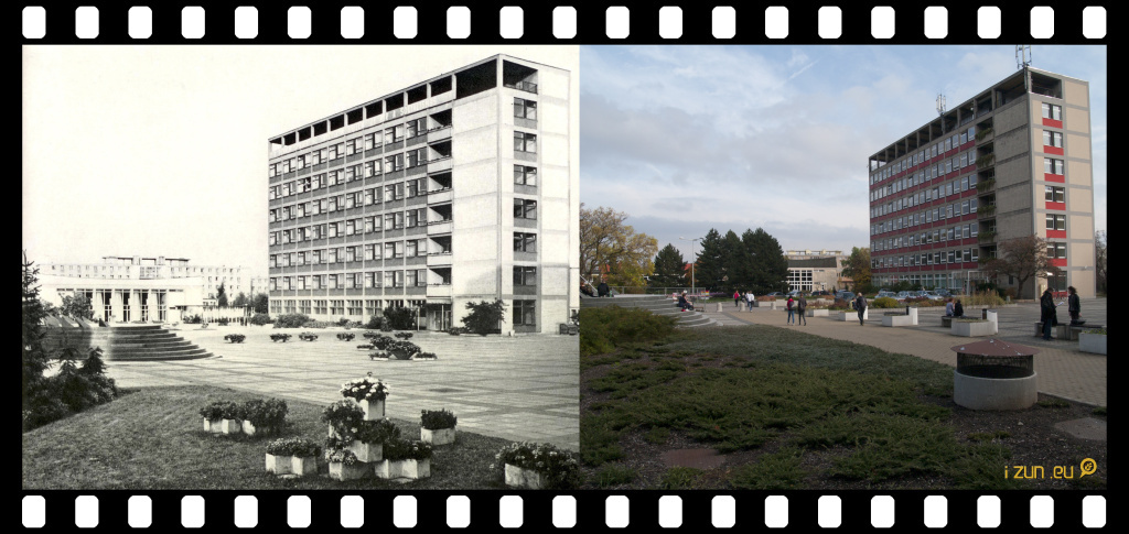 Z pohledu od rohu auly, dnes přes vzrostlé stromy není Provozně ekonomická fakulta téměř vidět.
