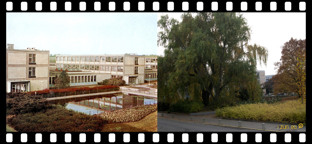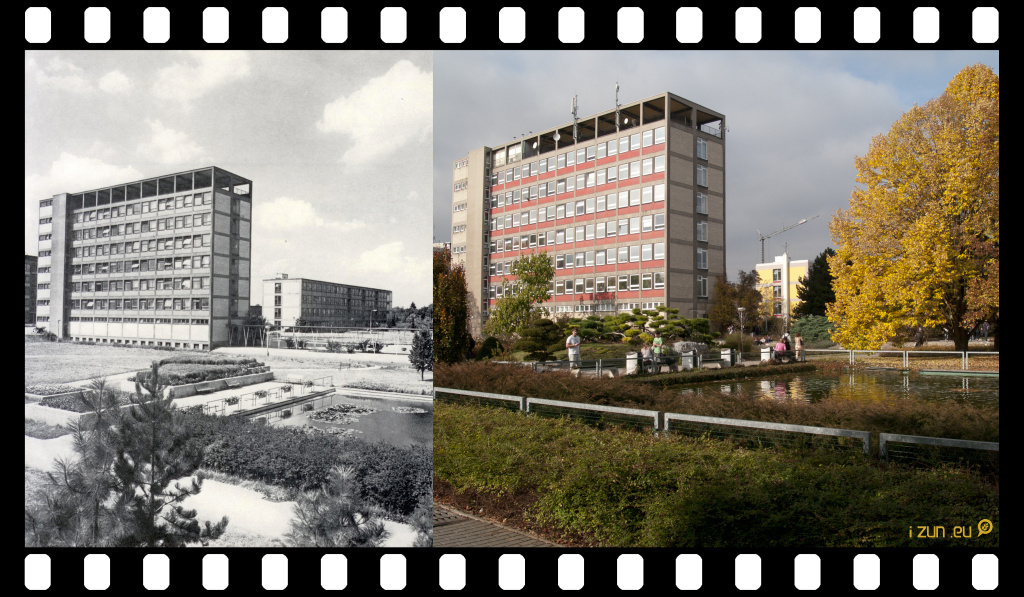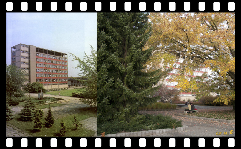Pohled na Fakultu potravinových a přírodních zdrojů od jezírka, která svůj vzhled na první pohled nijak výrazně nezměnila, avšak na jejím okolí je plynoucí čas vidět daleko více.