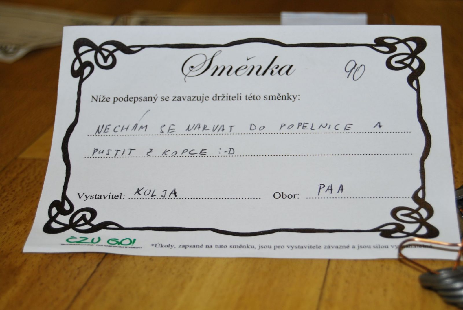 Po večeři následvala mafiánská noc a kasíno. Kdo chtěl získat žetony do začátku, musel se upsat směnkou. Směnka se vystavovala na nějakou činnost, kterou dlužník musel po dražbě provést. Směnky by se daly shrnout do čtyř kategorií. Oblíbené byly masáž či snídaně do postele, originální nechat se ostříhat na přání či příchod na oběd jen v přírodních materiálech, šílené pak zápas čtyř dívek v bahně jen ve spodním prádle či lekce líbání a naprosto šílené pak nechat na sebe vyklopit zbytky od oběda. Bylo kuře s bramborem a čočková polévka. Dotyčné si toto menu jistě budou dlouho pamatovat.