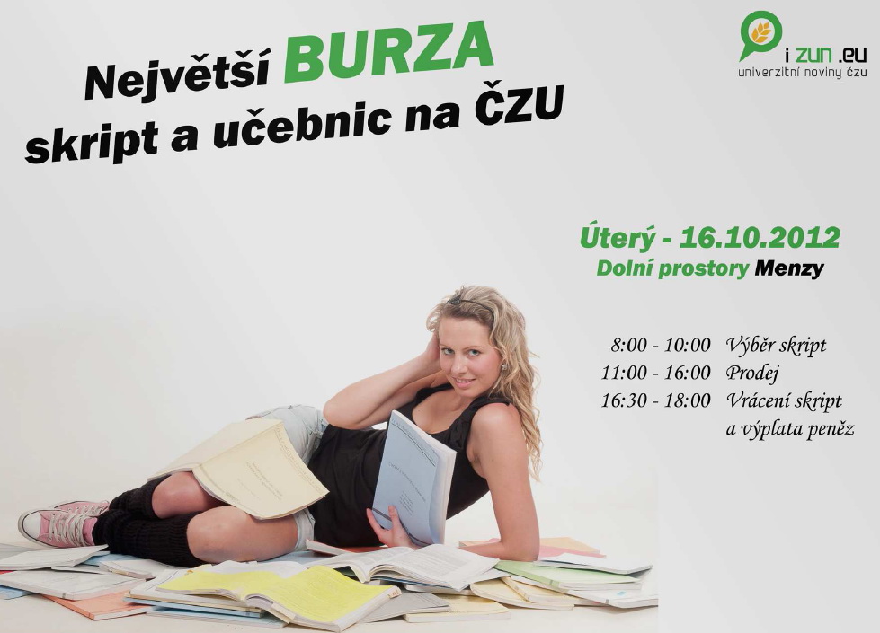Už 16. října proběhne v dolní čáti menzy Burza skript a učebnic. Pokud se Vám nechce stát ty děsivé fronty u skriptárny, tak určitě využijte této příležitosti. Učební materiál navíc získáte o dost levněji. Navíc se dost často stane, že vaše fakulta nevytiskne dostatek skript a ve skriptárně jednoduše dojdou.
