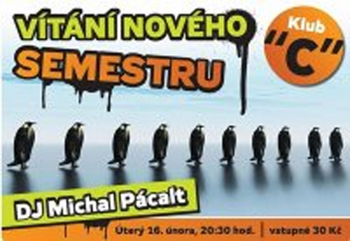 Hned 16.února můžete s přáteli zapařit na Vítání nového semestru v C-klubu s DJ Michalem Pácaltem. Vstupné bude klasických 30 Kč.