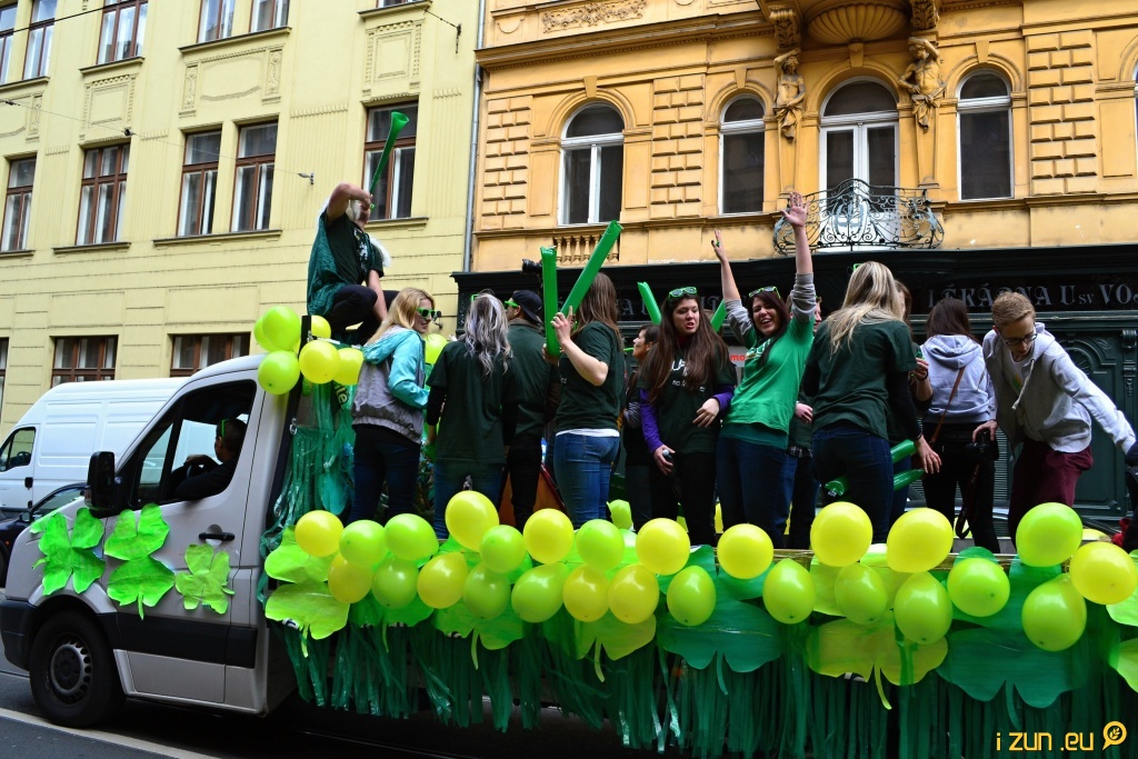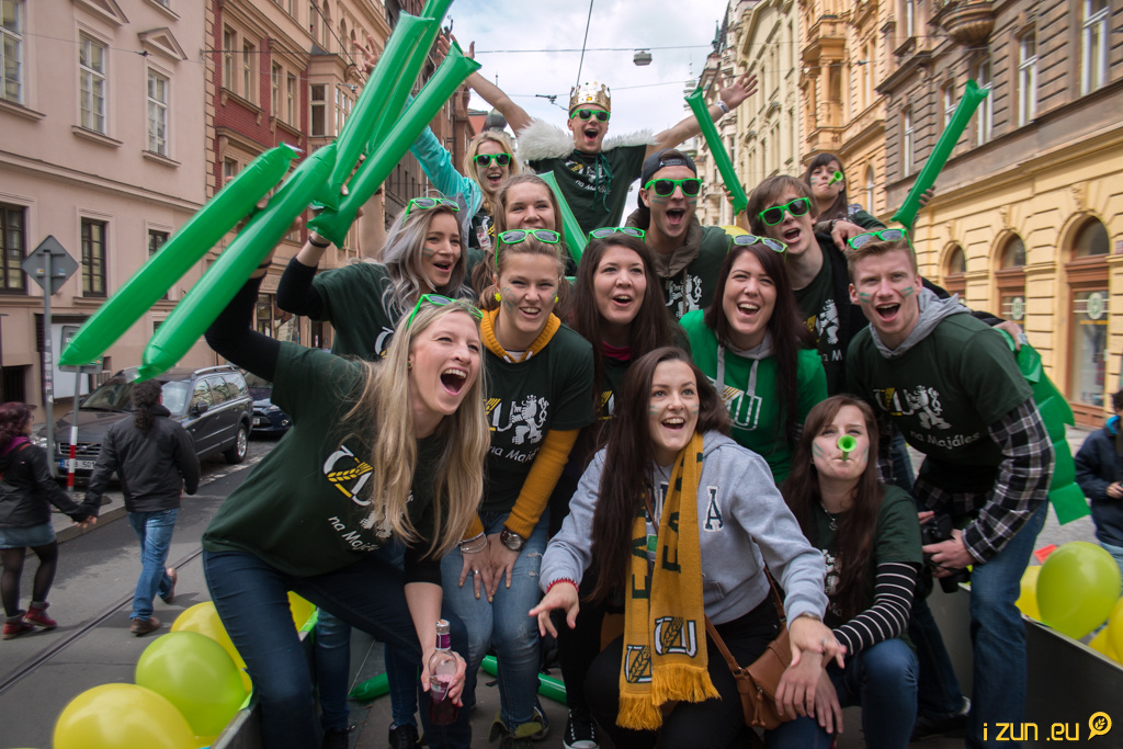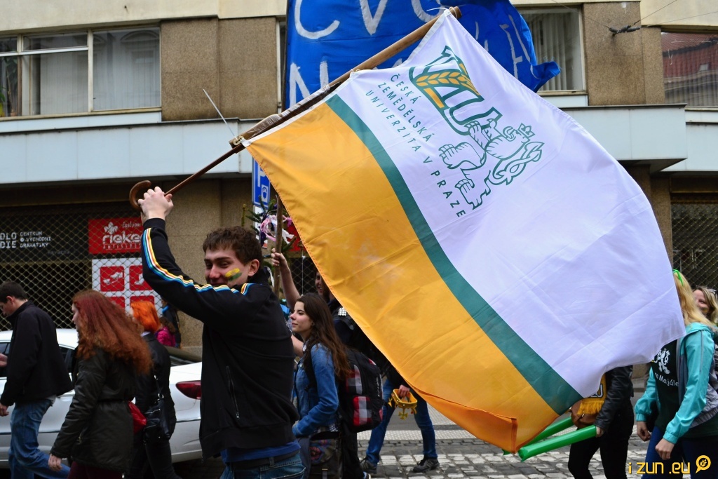 Poslední majálesový den odstartoval pochod s alegorickými vozy Prahou. Vyráželo se v jedenáct hodin z rohu Vodičkovy a Jungmannovy ulice, kde stála májka. Průvod za bezpečnostních opatření a přítomnosti Policie vyrazil skrz město, kde vzbudil pozornost turistů, ale i lidí v hromadné dopravě. Některé tramvaje byly zpomalovány, provoz aut na křižovatkách byl leckde zastaven úplně. Turisté vesele a s nadšením zdravili adepty na vozech a fotili se s lidmi z průvodu. I když v polovině trasy začalo pršet, studenti si to užívali. V prvním voze jel spolu s adeptkami na Miss i DJ N’zym a lidem zvedal náladu svou muzikou.