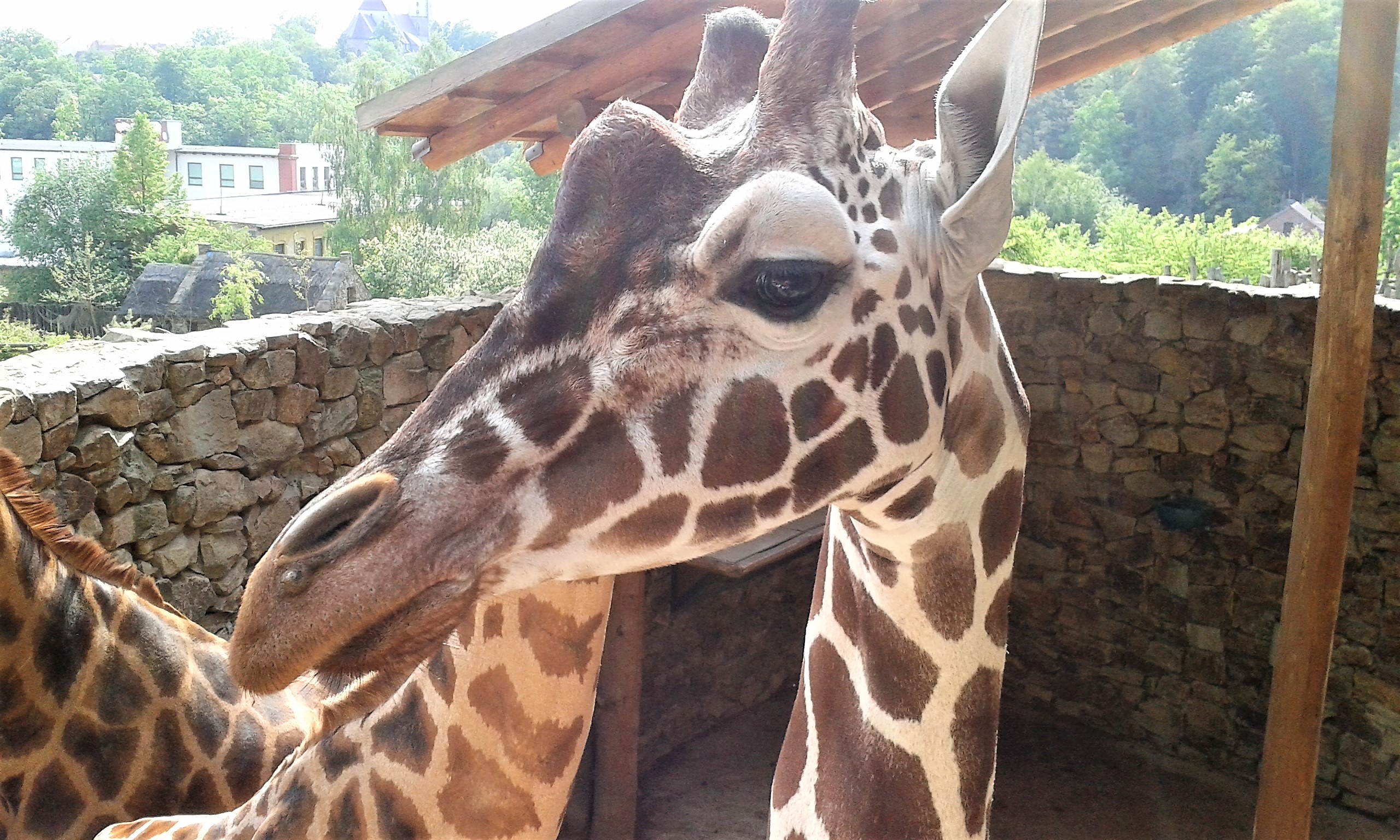 Během dne se u našeho stánku zastavila mimo jiné snad většina zaměstnanců zoo, aby prohodili pár slov. Zjistila jsem, že Derbianus tady všichni dobře znají. „Až budete mít chvilku, odpoledne, tak se půjdeme podívat na žirafy," slíbil nám ošetřovatel žiraf, milý pán v kovbojském klobouku. A tak o pár hodin později jsem klečela na betonovém ochozu s kbelíkem jablek a odstrkovala obrovskou hlavu zvědavého žirafího samce... Poprvé v životě jsem tak měla možnost krmit žirafy, a také jsme byly seznámeny s Darwinem; tedy s Kombou ušatou.