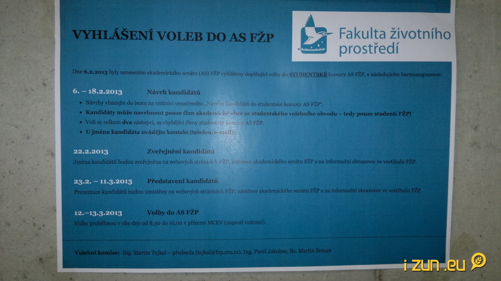 Do pondělí 18. 2. 2013 máte jedinečnou možnost navrhovat své kandidáty. Pokud je mezi vašimi spolužáky někdo, kdo je pro funkci ve fakultním AS jako stvořený, neváhejte a vhoďte jeho jméno do označeného boxu na vrátnici FŽP (doporučuji však pouze s jeho souhlasem). Nezapomeňte uvést kandidátův telefon či e-mail. Samotné volby proběhnou v termínu od 12. do 13. 3. 2013. Celý harmonogram voleb si můžete prohlédnout níže na fotografii nebo na fakultním webu www.fzp.czu.cz.