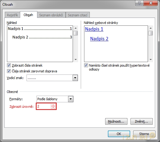 V dialogovém okně Obsah, v seznamu Zobrazit úrovně, pak jen nastavíte požadovaný počet úrovní. Pokud tak například zvolíte 2 úrovně, bude se v obsahu zobrazovat veškerý text, pro který je použit styl Nadpis 1 a Nadpis 2.