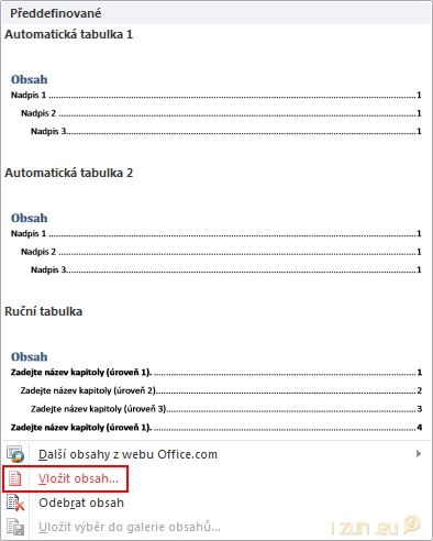 Možná vám bude stačit používat jednu z předdefinovaných automatických tabulek obsahu. Pokud ale například potřebujete jiný počet úrovní, klikněte na tlačítko Obsah a na možnost Vložit obsah.