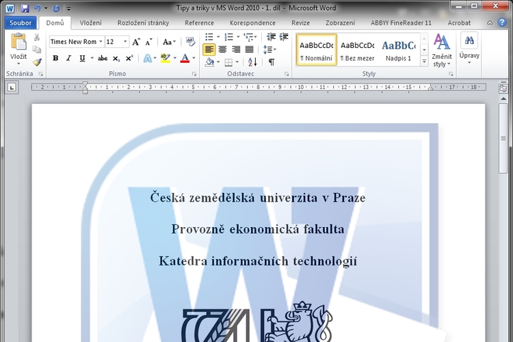 Ať už píšete bakalářku, diplomku nebo jen seminárku, určitě jste se někdy setkali s tím, že jste měli sto chutí vyhodit svůj počítač z okna, protože Word prostě odmítal pracovat podle vašich představ. Mohu vás ale ujistit, že i zde platí téměř 100 % ono známé, že chyba bude někde mezi klávesnicí a židlí. Předpokládám, že by každý ze studentů měl mít zažité typografické minimum a základní obsluhu tohoto programu, soudě alespoň podle osnov většiny oborů na ČZU. Jak sám název článku napovídá, všechny uváděné příklady budou prezentovány na MS Word 2010. Máte-li ale zrovna nainstalovanou verzi 2007, nevěšte hlavu, ono je to vesměs stejné… Naopak, někteří zarputile tvrdí, že nebudou přecházet z některé ze starších verzí MS Office (například verze 2003), protože se nechtějí učit s tou novější, která se tváří jinak. Je však otázka několika hodin (pro méně zdatné uživatele pak pár dní), než se s novější verzí naučíte. Odměnou vám pak bude snadnější a rychlejší přístup k většině běžně používaných funkcí.