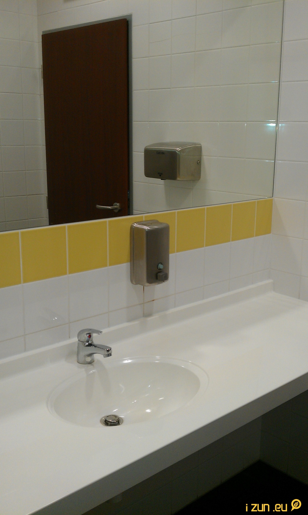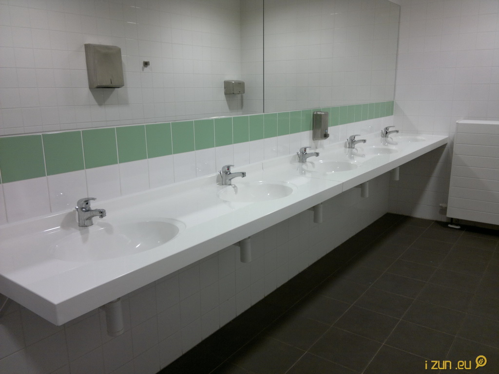 Mini umyvadla způsobující časté postříkání podlahy a její následné rychlé zašpinění. Asi důvod, proč je mezi umyvadly umístěn nápis „Udržujte čistotu!“
